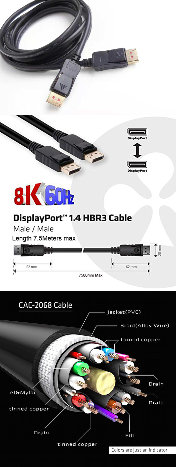 3D DisplayPort 1.4 HBR3 Cable enables the connection of your DisplayPort supported (Gaming) PC or Laptop to an (Ultra) High Resolution Monitor or other DisplayPort supported device. DisplayPort 1.4 adds support for Display Stream Compression 1.2 (DSC), Forward Error Correction, and extends the maximum number of inline audio channels to 32. It features locking DisplayPort connectors providing a secure, dependable connection.